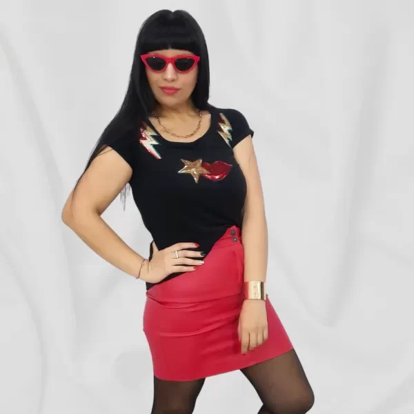 Falda de bengalina engomada, corte jean, con bolsillos traseros. cierre y boton