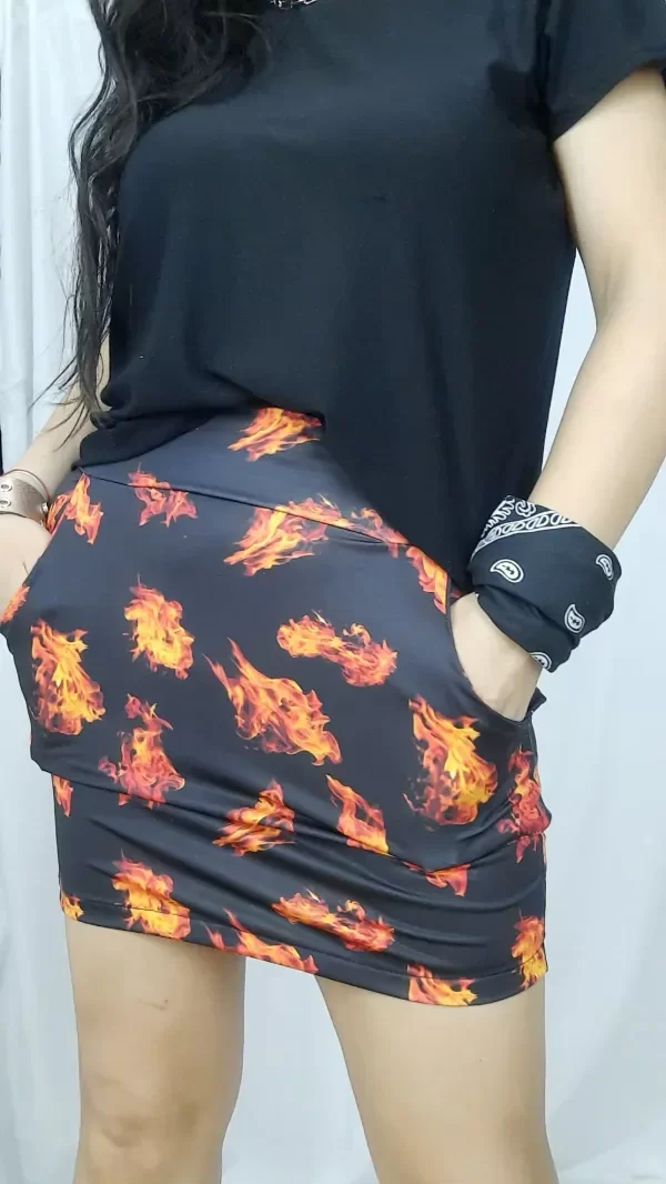 Mini de lycra con bolsillos, con cintura ancha. Estampa fuego.