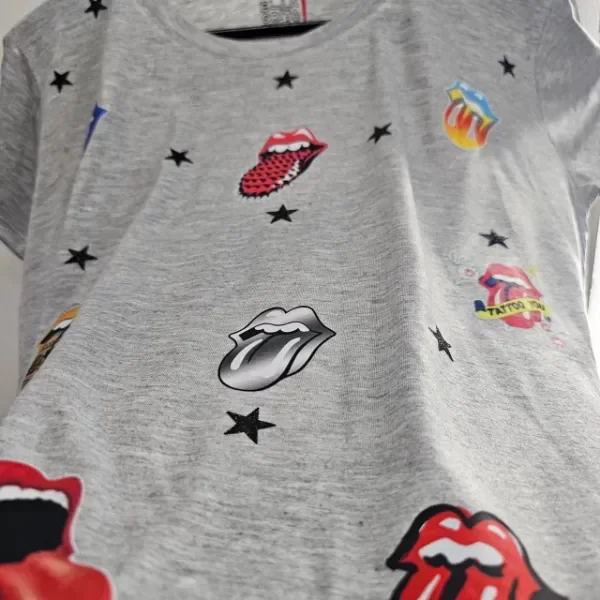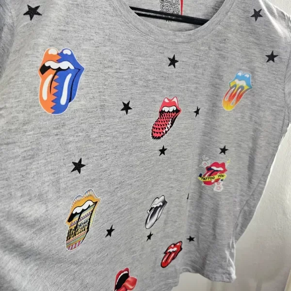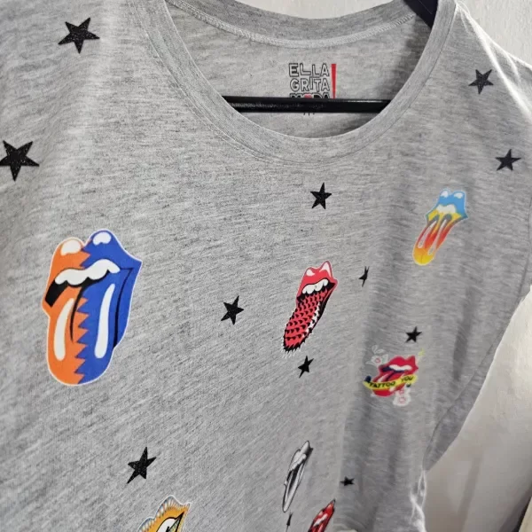 Remera gris, estampada con lenguas y aplique de estrellas.